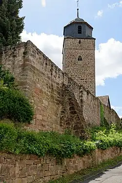 Der ehemalige Wehrturm aus Bruchsteinmauerwerk mit Eckquaderung in gotischem Stil ist fünfgeschossig. Er wurde von 2003 bis 2004 außen und innen saniert. Die unteren drei Geschosse weisen Schießscharten auf, das vierte Geschoss hat zweibahnige Maßwerkfenster, die im unteren Teil vermauert sind. Das oberste Geschoss ist durch ein umlaufendes Gesims abgesetzt. Dort befindet sich die Uhr, deren goldfarbene römische Ziffern in einem schwarzen Kreis auf einem weinroten, quadratischen Untergrund befestigt sind. Es gibt zwei Zifferblätter, jedoch nur ein Uhrwerk. Die Uhr wurde 2004 von der Glocken- und Kunstgießerei Rincker installiert. Der achtseitige hölzerne Helmaufbau ist mit Dachschindeln verkleidet. In ihm steht der Glockenstuhl für das Glockenspiel. Bekrönt wird er von einer niedrigen geschweiften oktogonalen Haube. An der Spitze des Glockenturms zeigt ein Wetterhahn aus Blech die Windrichtung an. Der Turm ist begehbar, jedoch nicht öffentlich zugänglich.