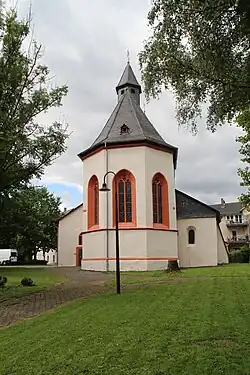 Der gotische Ostchor hat ein Joch und einen Fünfachtelschluss mit Kreuzrippengewölbe. Er wird außen mit den Jahreszahlen 1509 und 1709 bezeichnet. Die Rippen ruhen auf Konsolen, deren nördlicher einen Wappenschild trägt, der Kelch und Hostie zeigt.[5] Im Inneren öffnet ein spitzbogiger Triumphbogen mit roter Quaderbemalung und Fase an der Westseite den Chor zum Mittelschiff. Die beiden Schlusssteine werden mit Flammenornamenten umgeben. Gegenüber dem Mittelschiff ist der Chor um zwei Stufen erhöht. Die vier zweiteiligen Chorfenster mit flachen Spitzbögen und schrägen Gewänden haben spätgotisches Maßwerk.[15] Maßwerk und Umrahmung sind aus rotem Sandstein gefertigt. Die Außenwände des Chors werden durch zwei umlaufende, rote Gesimse gegliedert, die sich vom weißen Außenputz abheben. Ein Gesims ist am Sockel und ein weiteres unterhalb der Chorfenster angebracht.