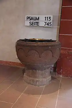 Der romanische, pokalförmige Taufstein am südlichen Chorbogen hat einen Rundbogenfries und ein Tauband. Er stammt ebenso wie der Blockaltar, der von einer roh behauenen Sandsteinplatte bedeckt wird, aus der Bauzeit der Kirche.[17] Das hölzerne Kruzifix des Dreinageltypus auf dem Altar datiert aus dem Anfang des 18. Jahrhunderts.