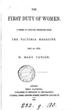 - ↑ Mary Taylor: The First Duty of Women. Victoria Press, London 1870, S. 156.