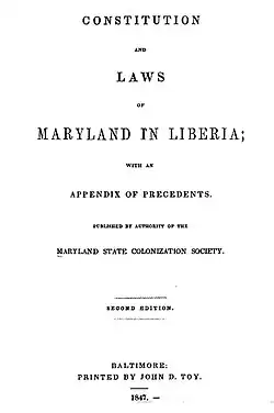 - The State of Maryland (Hrsg.): Constitution and Laws of Maryland in Liberia. John D. Toy, Baltimore 1847, S. 212 (eingeschränkte Vorschau in der Google-Buchsuche).