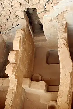 Um die untere Terrasse (39) für einen Palastbau nutzen zu können, musste an der nordöstlichen Ecke zunächst eine 12 m hohe Stützmauer aufgeführt werden. Die Bauten auf dieser Terrasse sind am besten erhalten. Hier ermöglichte ein rechteckiger Saal (10,3 m × 9,0 m) mit umlaufenden Kolonnaden Panoramablicke auf die umgebende Wüstenlandschaft.[85] Man kann ihn sich gut als überdachtes Triclinium vorstellen. Die Säulen und Halbsäulen aus Kalkstein mit einer Kannelierung aus Stuck folgen der korinthischen Ordnung und stehen auf erhöhten Wandsockeln, die mit Fenstern abwechselten. Nach Bedarf konnte man diese Fenster wohl mit hölzernen Läden schließen. Die Zwischenräume der Halbsäulen waren mit Wandmalereien des 2. Pompejanischen Stils dekoriert. Foerster weist darauf hin, dass dieser Bankettsaal in der Tradition alexandrinischer Palastarchitektur steht.[86] An der Ostseite gelangte man in ein kleines Badehaus G, an der Westseite ins Treppenhaus und auf diesem Weg hinauf zur mittleren Terrasse (38).