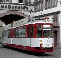 Auch die Straßenbahn Nordhausen beschaffte 1991 eine Serie Stuttgarter GT4. Vier der insgesamt zwölf Wagen erhielten eine Modernisierung.[27] Die neuen Fahrzeuge ersetzten die Gothawagen der Baujahre 1959/1960.[28] 1995 erhielt Nordhausen insgesamt sieben weitere Wagen aus Freiburg in Zweirichtungsausführung; drei davon dienten als Ersatzteilspender.