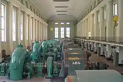 Im Maschinenhaus sind Turbinen, Generatoren und in sehr alten Kraftwerken auch die Leitwarte untergebracht und so vor Witterungseinflüssen geschützt. An der Decke des Maschinenhauses befinden sich ein oder zwei Brückenkräne mit der Laufkatze, mit deren Hilfe die oftmals viele hundert Tonnen schweren Maschinenteile montiert werden können.