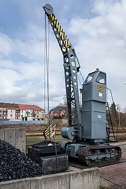 Nachdem in der neugegründeten DDR kaum Steinkohlevorkommen lagen, Braunkohle aber in großen Mengen zur Verfügung stand, wurde auch die Feuerung der Dampflokomotiven in Löbau auf Braunkohle und Braunkohlebriketts umgestellt. Ab 1. Januar 1955 gehörte die Lokeinsatzstelle Löbau zur neu gegründeten Reichsbahndirektion Cottbus und erhielt fortan auch wieder Steinkohlelieferungen aus Polen und später auch aus der Ukraine.[55] Um 1960 wurden am südlichen Kohlegleis Modernisierungen vorgenommen. So wurde ein neuer Ausschlack-Kanal errichtet, welcher fortan mit maschineller Unterstützung entleert werden konnte. Der dazu errichtete Portalkran erstreckt sich über das Kohlegleis und ein ebenfalls neu angelegtes Stumpfgleis für den Schlacke-Wagen.[56]