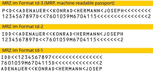 - ein ebenfalls zweizeiliger Bereich mit jeweils 44 Zeichen pro Zeile für Reisepässe im großen Format ID-3 / td-3[2] (oder MRP machine readable passport) auf der Vorderseite der Karte.