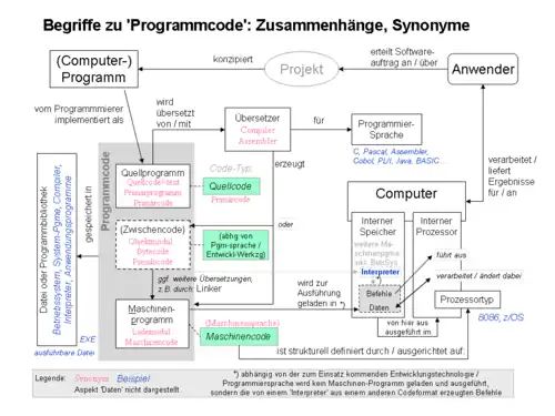 Manchmal werden Ausdrücke wie „Maschinencode, Maschinensprache, Binärcode, nativer Code, Programmcode“ synonym verwendet.[2] Sie können jedoch zwei unterschiedliche Bedeutungen haben: