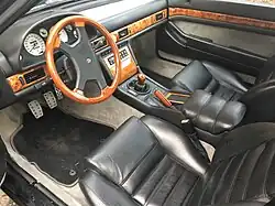 Die äußeren Blechteile waren weitgehend neu gestaltet. Das Design verantwortete Marcello Gandini, der kurz zuvor mit dem Shamal bereits einen weiteren Biturbo-Ableger entworfen hatte. Dementsprechend war der Ghibli eine „stilistisch weniger aggressive“[4] Weiterentwicklung des Shamal; gelegentlich wurde er als „domestizierte Version des Shamal“ bezeichnet.[5] Maserati übernahm die vorderen Stoßstangen des Shamal und die auffällige Abdeckung der Wischerachsen und Lüftungsschlitze am unteren Ende der Windschutzscheibe. Die Kotflügel des Ghibli waren ebenfalls stark ausgestellt; sie erreichten allerdings nicht die Dimensionen der Shamal-Kotflügel. Auch die Scheinwerfereinheiten – je ein runder und ein viereckiger Scheinwerfer – waren gleich, allerdings befanden sie sich nunmehr hinter einer Glasabdeckung, was von vielen Beobachtern als eine stilistische Verbesserung empfunden wurde. Schließlich trug der Ghibli ebenso wie der Shamal einen höheren Kofferraumdeckel, der allerdings im Detail anders gestaltet war. Mit diesem Stilelement zitierte der Ghibli den zeitgenössischen BMW M3.[6] Der Innenraum war geprägt von Connolly-Leder und Echtholzapplikationen.