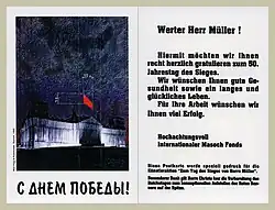 Am 8. Mai 1995, dem Jahrestag des Ende des Zweiten Weltkrieges, schickte der Masoch Fund 5500 Grußkarten an zufällig ausgewählte Berliner Bürger, die den Nachnamen Müller trugen, den häufigsten deutschen Nachnamen. Sie bekamen Grüße des Masoch Funds mit den Worten „Happy Victory Day!“ und ein Bild des Reichstags von 1945 mit einer roten Fahne sowie ein Foto des 1995 von Christo und Jeanne-Claude verpackten Reichstags; Symbole für den Beginn und das Ende der 50-jährigen Nachkriegsgeschichte. Das Projekt dekonstruierte damit auch das Bild der „Gewinner“ und „Verlierer“ des Zweiten Weltkrieges, denn 1995 hatte Deutschland bereits wieder einen wirtschaftlich und politisch mächtigen Status erreicht, während die Sowjetunion, die den Krieg scheinbar gewonnen hatte, nicht mehr existierte.