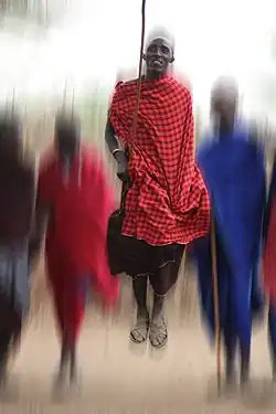 Es gibt viele Zeremonien. Sehr bekannt ist das springende Tanzen der Männer, genannt Adumu. Die jungen Massai, Morani, springen dabei auf der Stelle so hoch wie möglich und beweisen so ihre Stärke. Das Töten eines Löwen war früher Voraussetzung, eine Frau haben zu dürfen. Es gibt Anzeichen, dass dies in abgelegenen Gebieten auch heute noch zelebriert wird. Ebenso mussten die jungen Männer oft jahrelang in einem eigens von ihnen gebauten Dorf wohnen. Dafür gibt es heute keinen Platz mehr.