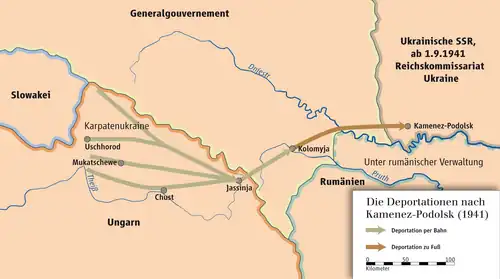 Vom Sammelpunkt Kőrösmező wurden die Juden täglich in Gruppen von rund 1000 Personen nach Kolomyja in Süd-Galizien transportiert, das sich noch unter ungarischer Militärhoheit befand. Bis zum 10. August 1941 sammelten sich dort rund 14.000 Juden, bis Ende August erhöhte sich diese Zahl um weitere 4000. Im gleichen Zeitraum trieben ungarische Einheiten die Ankömmlinge in Gruppen zu je 300 bis 400 Personen von Kolomyja aus über den Dnister in eine von deutschem Militär verwaltete Gegend und untersagten ihnen unter Androhung von Waffengewalt die Rückkehr nach Ungarn. Ukrainische Milizen beraubten die Deportierten vielfach ihrer letzten Wertsachen.[16][6] Die Vertriebenen sollten sich nach Kamenez-Podolsk, Butschatsch, Tschortkiw oder Stanislawiw wenden.