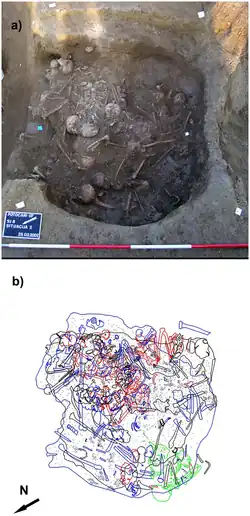- ↑ a b Mario Novak et al.: Genome-wide analysis of nearly all the victims of a 6200 year old massacre. In: PLoS ONE. Band 16, Nr. 2, 2021, e0247332, doi:10.1371/journal.pone.0247332.