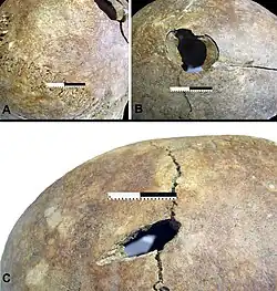 Im Jahr 2017 wurden die Beschädigungen von vier Schädeln in einer Studie detailliert beschrieben. Demnach wurden diese Schädel jeweils auf ihrer rechten Hälfte durch mehrere massive Schläge zertrümmert. Die Verletzungen der Schädelknochen wurden teils durch spitze, teils durch flache Werkzeuge verursacht. Dadurch entstanden Schnittwunden, Löcher und Trümmerbrüche, die vermutlich von mehreren Angreifern mit jeweils unterschiedlicher Bewaffnung herbeigeführt wurden. Die Position der Schäden – zumeist seitlich rechts am Hinterkopf – wurde als typisch für einen hinter der Person zuschlagenden Rechtshänder und daher als Beleg für eine Hinrichtung interpretiert. Vergleichbare Beschädigungen wiesen neun andere Schädel auf; diese 13 Schädel stammten von sechs Kindern, drei Männern und vier Frauen. Die Knochen des Körpers unterhalb des Schädels hingegen ließen keine Verletzungen erkennen, was als weiterer Hinweis darauf gedeutet wurde, dass die Toten keiner Kampfhandlung, sondern einem Massaker zum Opfer fielen.[3]