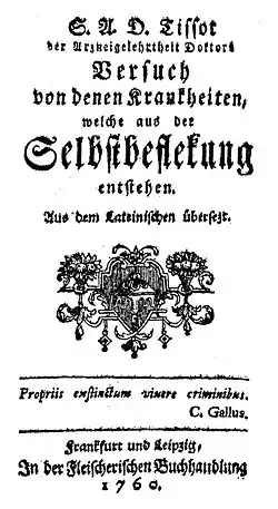 Titelblatt von S.A.D. Tissot: Versuch von denen Krankheiten, welche aus der Selbstbeflekung entstehen (1760)
