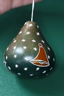 Bei diesen typischen Produkten des peruanischen Kunsthandwerks aus dem nach dem Río Mantaro benannten Valle del Mantaro in der Provinz Huanta in der Ayacucho-Region, wird die Kürbisoberfläche mit glühenden Holzstäben unterschiedlich stark gebräunt, wobei helle Töne durch Ausschnitzen erreicht werden.