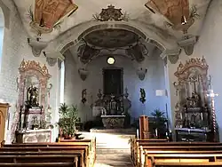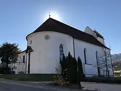 Die Saalkirche wurde 1776 nach einem Entwurf von Christian Großbayer errichtet. Sie besteht aus einem Langhaus, einem eingezogenen, halbrund geschlossenen Chor im Osten und einem Kirchturm im Westen, der aus der Achse des Langhauses nach Süden verschoben ist, und mit einem Satteldach zwischen Staffelgiebeln bedeckt ist, in denen sich die Zifferblätter der Turmuhr befinden. Das oberste Geschoss des Kirchturms beherbergt hinter den Klangarkaden den Glockenstuhl, in dem vier Kirchenglocken hängen.[1] Die Decke im Chor erhielt 1778 ein Fresko, auf dem Mariä Himmelfahrt dargestellt ist. Die Kirchenausstattung entstand um 1780. Die Orgel wurde 2002 als Opus 222 von Stehle Orgelbau[2] errichtet.