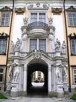 1709 wurde das große Portal mit seinen riesigen Telamoniden von Mathias Strickner gefertigt. Er baute mit seinen Leuten die Architektur des Steintores.[6]