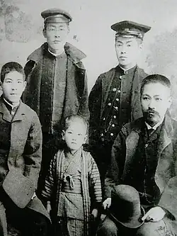 - ↑ Hinten links Eikyū, rechts Yanagita Kunio, vorne von links nach rechts Matsuoka Kanae, Matsuoka Fuki, (Kanaes Sohn), und Suzuki Hiroshi (鈴木博). Die Aufnahme entstand um 1897.