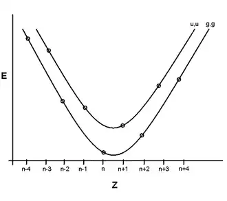 Energieparabeln für u,u- und g,g-Kerne mit möglichen Nukliden: Laut Mattauchschen Isobarenregel liegt das stabilste Nuklid mit Z=n im Minimum der Parabel.