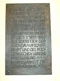 Würzburg, Maulhardgasse 2/Ecke Katharinengasse/Eingang Kaufhof: Gedenktafel an Matthäus Friedrich Chemnitz, der den Liedtext zum Schleswig-Holstein-Lied schrieb.