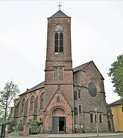 Bei den Bauarbeiten an der geosteten neogotischen Kirche kam es in einer frühen Bauphase am 27. Oktober 1892 zum Einsturz des Turms. Dabei wurden große Teile des bereits aufgemauerten Langhauses zerstört. Da die Ursache für den Einsturz in einer unzureichenden Fundamentierung lag, musste die Bauruine vollständig abgetragen werden. Längere gerichtliche Auseinandersetzungen verzögerten zunächst einen erneuten Baubeginn.