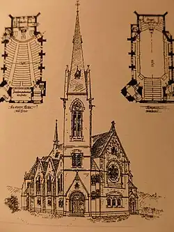 Matthäuskirche, Grundriss Erd- und Emporengeschoss, Nordwestansicht (Monatszeitschrift für Gottesdienst und kirchliche Kunst, 3, 1898)