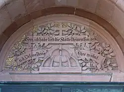 Von der durchgreifenden Umgestaltung verschont blieb der Haupteingang, an dem sich reichere Bauzier konzentriert. Das gestufte Säulenportal ist von einem kleinen Vorbau mit Giebel umgeben. Die Säulen weisen Knospenkapitelle auf. Das Tympanonfeld ist als Relief gestaltet: Auf einem als Goldmosaik anmutenden Grund entfaltet sich, umgeben von Lorbeerzweigen, eine Banderole mit der Bibelinschrift „Herr, ich habe lieb die Stätte deines Hauses und den Ort, wo deine Ehre wohnt“.(Ps 26,8 ). Darüber erhebt sich ein Kleeblattkreuz und ein Brunnen mit mittiger Fontäne und fünf Ausgüssen. Der äußere Rundstab des Portalbogens ist ornamental mit gekreuzten Bändern und Blüten verziert. Über dem Typanon erscheint ein Kleeblattbogenfenster. Die Giebelspitze des Portals sird von einer dreiblättrig reliefierten Blüte ausgefüllt. Eine Kreuzblume bekrönt das Portal.
