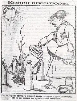 Nach dem Friedensvertrag von Brest-Litowsk tat er seinen Dienst zuerst in der neu gegründeten Ukrainischen Armee, stellte jedoch ab Dezember 1918 eine Partisanenarmee auf, um gegen die von den Mittelmächten beeinflusste Regierung und die von der Entente geschickte Truppen vorzugehen.[3] Hryhorjews Truppe umfasste am Zenit etwa 12.000 Mann und operierte hauptsächlich im Gouvernement Cherson. Die Truppe war bunt zusammengewürfelt und bestand auch aus vielen Kosaken und anderen Soldaten der ehemaligen russischen Armee, die nach dem Untergang des Kaiserreichs die Seiten wechselten. Einen großen Erfolg konnte Hryhorjew verzeichnen, als er die letzten französischen Truppen aus Odessa vertreiben konnte. Er forderte eine „Ukraine für Ukrainer“ und hoffte zeitweise, Hetman der Ukraine zu werden.[4] Bis zum Mai 1919 waren seine Truppen Teil der Roten Armee, jedoch begannen die Soldaten am 4. Mai 1919 Pogrome gegen Juden und gegen bolschewistische Kommissare. Das brachte Hryhorjew in eine schwierige Situation, denn zum einen kooperierte er zu diesem Zeitpunkt mit den Bolschewiki, zum anderen musste er jedoch auch das komplizierte Gefüge in seiner Truppe beachten, in der die antibolschewistischen Strömungen zunehmend an Einfluss gewannen.