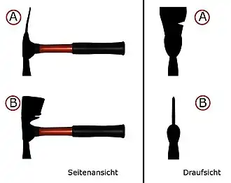 Maurerhammer (A) und Gipserbeil (B) im direkten Vergleich