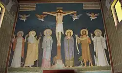 Das fünf Meter breite und vier Meter hohe Wandgemälde mit Kreuzigungsgruppe zeigt von links nach rechts: Katharina (mit Rad), Josef (mit blühendem Stab), Maria, Jesus am Kreuz, Johannes, Johannes der Täufer (mit Kreuzstab und angelehnter Axt an einem Baum) und Cäcilia (mit Orgelpfeifen). Am Sockel des Kreuzes entspringen die vier heiligen Flüsse, an denen ein Hirsch trinkt. Über der Gruppe schweben die vier Evangelisten.
