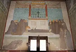 Dieses Gemälde verwendet, als einzige Darstellung am gesamten Bauwerk, eine perspektivische Ansicht. Dies zeigt sich an der Aufstellung der Gruppierung der Mönche und an der Darstellung der Empore und Treppenstufen.