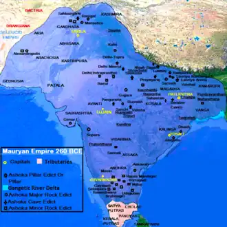 Unter Ashoka erreichte das Maurya-Reich seine größte Ausdehnung. Die Fläche wird auf etwa 5.000.000 km² geschätzt und die Einwohnerzahl auf etwa 50–60 Millionen, was es zu einem der bevölkerungsreichsten Reiche der Antike macht.[6]