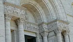 Das Relief über dem Portal, eine Arbeit des Bildhauers Albert Comes (1883–1954) zeigt in der Mitte den Fürsten, links die Huldigung der Krieger, Jäger und Reiter, rechts die Huldigung der Künste, des Gewerbes und der Landwirtschaft. Die Kapitelle der vier Säulen tragen jeweils eines der Symbole der vier Evangelisten. Über dem Relief befindet sich das Wappen der Fürsten zu Schaumburg-Lippe.