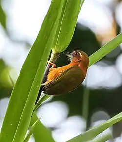 - Sasia ochracea Hodgson 1837: Zurzeit drei Unterarten. Neue Untersuchungen zeigen jedoch eine große genetische Differenzierung allein in der Nominatform, die eine wesentlich größere Anzahl an Unterarten berechtigt erscheinen lässt.[18] 3 Zehen, 10 Steuerfedern.
