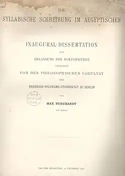 - Die Syllabische Schreibung im Aegyptischen. Inaugural-Dissertation zur Erlangung der Doktorwürde, genehmigt von der Philosophischen Fakultät der Friedrich-Wilhelms-Universität zu Berlin. Pries/Fritzsche, Leipzig 1908.