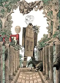 Der Künstler übernahm von Giorgio de Chirico, dem Hauptvertreter der Pittura metafisica, frühzeitig die Idee, in der Malerei Bildmotive in rätselhaften Kombinationen zusammenzustellen; diese Idee wurde später von den Surrealisten übernommen. Sie entsprach der freien Assoziation, die Sigmund Freud anwendete, um das Unbewusste in den Gedanken seiner Patienten, das sich in Träumen äußerte, freizulegen. 1919 entstand, angelehnt an die Pittura metafisica, das Gemälde Aquis submersus. Der Titel orientiert sich an Theodor Storms gleichnamiger Novelle.[65] Eine der bekanntesten Collagen aus der Kölner Zeit ist Der Hut macht den Mann aus dem Jahr 1920, bei dem es sich ursprünglich um eine Druckvorlage für einen Werbekatalog seines Schwiegervaters handelte, der eine Hutfabrik besaß.[66] Celebes, geschaffen 1921 in Köln, gehört als erstes Werk zur Gruppe der Gemälde, die Max Ernst zwischen 1921 und 1924 in der Zeit des Übergangs zwischen Dada und Surrealismus malte.[67] Das Gruppenporträt Das Rendezvous der Freunde entstand 1922 nach Ernsts Übersiedlung nach Paris.