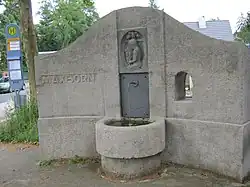 Unter dem Bildnis fließt Wasser aus einer gebogenen Röhre in ein kleines Brunnenbecken am Fuß der Brunnenwand. Auf der linken Seite der Wand ist in Großbuchstaben die Inschrift MAXBORN. eingelassen. Auf der rechten Seite befindet sich eine kleine Wandnische mit einem Rundbogen, die möglicherweise einem Grablicht diente.