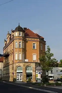 Das Anwesen wurde im Jahr 1900 vom Bad Kissinger Architekten Carl Krampf in Formen der Neurenaissance errichtet. Der dreigeschossige Walmdachbau unterscheidet sich von anderen Beispielen der Klinker- beziehungsweise Haustein-Architektur durch seine Konzeption als Eckgebäude sowie einen leichten Barockeinfluss im Hausteindetail. Die ursprünglichen Balkone an der Straßenseite wurden später abgebaut. Heute befinden sich in dem Anwesen Wohnungen und ein Computergeschäft.