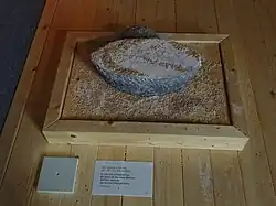 Da die Deckschicht im Mayener Grubenfeld – anders als bei Mendig[14] – an einigen Stellen im Lauf der Zeit durch Erosion soweit abgetragen worden war, dass das Basaltgestein offen zu Tage trat, waren die Vorkommen bei Mayen bereits in vorgeschichtlicher Zeit bekannt. Nachdem aufgefallen war, dass sich der Mayener Basalt aufgrund seiner Härte und Porosität hervorragend zum Zerreiben von Getreide eignete, entwickelte sich bereits in der Frühzeit eine regelmäßige Nutzung des Gesteins, insbesondere zur Herstellung von Reibsteinen.[15] Früheste Funde von Reibsteinen aus Mayener Basalt werden in die Jungsteinzeit (Jungneolithikum, ca. 5000 v. Chr.), datiert. Zunächst wurden aber nur die an der Oberfläche liegenden Steinblöcke gesammelt und verwertet. Größere Blöcke wurden durch Feuersetzen und mit Hilfe von Keilen und Hebeln zerkleinert.[16] Ab der Urnenfelderzeit (um 1000 v. Chr.) finden sich erste, flache Steinbruch-Gruben, die in den Basalt getrieben wurden.[17]