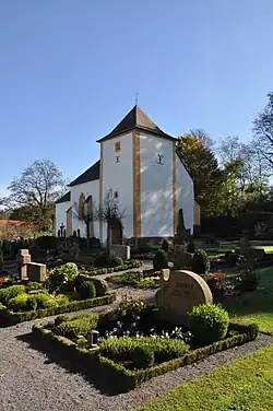 Insbesondere südlich des Nüßbaches finden sich einige alte Bauernhäuser. Dort steht auch die nach den Plänen des Dombaumeisters Reinhold Wirtz[12][13] von 1896 bis 1898 erbaute Pfarrkirche St. Bartholomäus. In unmittelbarer Nähe befindet sich auch die ehemalige Pfarrkirche, heute als Friedhofskapelle genutzt. Sie zählt zu den in der Westeifel verbreiteten spätgotischen Einstützenräumen, die im späten 15. und frühen 16. Jahrhundert entstanden sind. In der Umgebung der Kapelle sind einige sehr alte Grabsteine und -kreuze vorhanden.