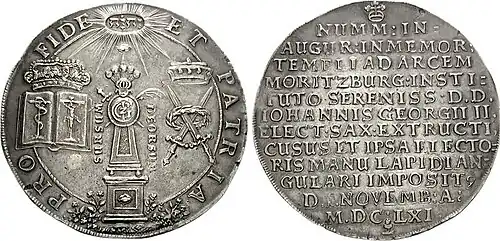- Ob der Taler auf den Bau von Schloss Moritzburg in Zeitz tatsächlich als Münze geprägt worden ist, wie u. a. in Münzkatalogen angegeben, kann trotz der Ausprägung im Reichstalergewicht fraglich sein. Wilhelm Ernst Tentzels Bezeichnung als Medaille ist wegen des hohen Reliefs und der Seltenheit der einzelnen Stücke sowie wegen fehlendem Münzmeisterzeichens jedenfalls naheliegend.