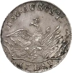 - Die sogenannten Hoym-Münzen sind Privatausgaben, deren Herstellung zu privaten Zwecken erfolgte. Sie wurden wegen „Münzvergehen“ eingeschmolzen.[25] Da die noch vorhandenen Hoym-Münzen keine staatlichen Ausgaben sind, könnten sie auch den Medaillen zugeordnet werden. Gelegentlich werden sie auch als Gedenkmünzen bezeichnet. Auf den Geprägen ist das Geburtsdatum des Ministers v. Hoym • D • 20 • AUGUST • aufgeprägt, statt EIN REICHS THALER, wie bei der Umschrift auf den unveränderten Münzen des normalen Zahlungsverkehrs.