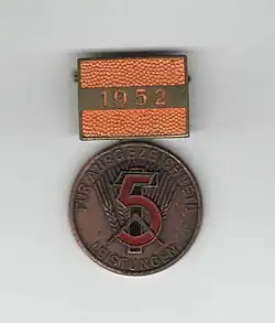 Die Zweite Form der Medaille, welche von 1952 bis 1955 verliehen ist die Symbolik nahezu gleich geblieben, sie wurde nur dem nun verringerten Durchmesser der Medaille auf 29,5 mm angepasst. Die 5 auf dem Avers der Medaille war ab diesem Zeitpunkt rot lackiert, der Hammer schwarz ausgelegt. Getragen wurde auch diese Medaille an einer 24 × 18 mm großen Spange die orangegelb emailliert und dessen Grund gekörnt war an der linken oberen Brustseite. Zusätzlich war auf der Mitte der Spange ein waagerechter 5 mm breiter Balken mitgestanzt worden auf dem die Jahreszahlen der Verleihung: 1952, 1953, 1954 und 1955 zu lesen ist.