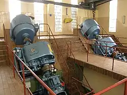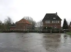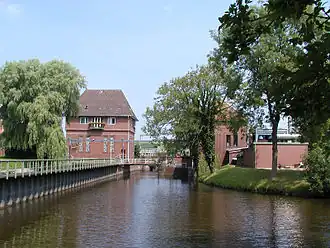 - dem Schöpfwerk II von 1953/55 (Inschrift) als zweigeschossiger Backsteinbau mit ziegelgedecktem Walmdach und Erdgeschoss mit großen Fenstern. Erbaut als Ergänzungsschöpfwerk, das vorrangig die Medem entwässert.[6]
