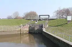 - der Medemschleuse 1961–64 mit Wasserbecken und ersetztem Schleusentor von 1994; Schleusenkammer im Deichkörper verborgen, erhält aber Tageslicht durch ein Fenster,[2]