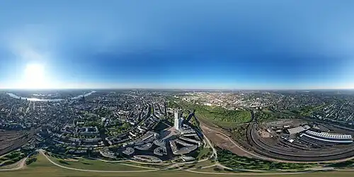 Der in der Kölner Neustadt-Nord gelegene Mediapark ist ein oberirdisch autofreier Gebäudekomplex, dessen einzelne Bauwerke durch Fußgängerwege miteinander verbunden sind, der Lieferverkehr und die Zufahrt erfolgen über eine unterirdische Ringstraße. Die siebenstöckigen Gebäude mit dem Kölnturm als Akzent sind halbkreisförmig um einen zentralen Platz mit künstlichem See angeordnet, womit eine (post-)moderne Variante der Piazza del Campo in Siena angedeutet werden soll.[5][6] Sie wurden nicht gleichzeitig, sondern in teilweise größerem zeitlichen Abstand errichtet.