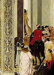 Domenico Ghirlandaio: Anbetung der Könige (Fresko, 1485/1490); Ausschnitt mit der Medici-Giraffe (Tornabuoni-Kapelle, Santa Maria Novella, Florenz)