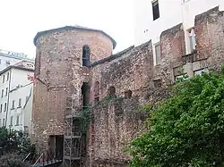 Der jugendliche Kaiser Valentinian II. verweilte in den Jahren von 378 bis 387 die meiste Zeit in Mediolanum, und gegen dessen Widerstand erreichte Ambrosius, dass der um 385 ausgesprochene Wunsch der Mutter des Kaisers, Justina, am Hofe weilenden Arianern eine Kirche Mediolanums zu überlassen, nicht verwirklicht wurde. Auch gegen Kaiser Theodosius I., den in Mediolanum 395 der Tod ereilte, vertrat der energische Bischof erfolgreich die Interessen des Klerus.[36] Unter Ambrosius erlangte die Kirche von Mailand eine gewisse Eigenständigkeit gegenüber dem Papst und verteidigte sie auch noch längere Zeit im Mittelalter. Der Dichter Ausonius drückte im späten 4. Jahrhundert schriftstellerisch seine Bewunderung für die Pracht von Mediolanum aus rechnete es als die siebtgrößte Stadt des Römischen Reichs. Nach seiner Beschreibung gab es zahlreiche elegante Häuser in der Stadt, die von einem doppelten Mauerring umgeben war. Unter den hervorstechendsten Gebäuden erwähnte der Dichter ein Theater, einen Circus, mehrere Tempel, den Kaiserpalast und die Münzstätte. Ferner waren die Hercules-Thermen so bedeutend, dass nach ihnen ein Stadtviertel benannt war. Die zahlreichen Portiken der öffentlichen Gebäude waren mit Marmorstatuen geschmückt.[37] Von den durch Ausonius beschriebenen Bauten fanden sich nur geringe Überreste.