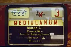 Der erste TEE Mediolanum startete am 15. Oktober 1957 von Mailand über Verona, Trient, Bozen, Brenner, Innsbruck und Kufstein nach München, zunächst unter der Zugnummer TEE 395/396.[3] In Österreich, dessen Bahn ÖBB damals dem TEE-Abkommen noch nicht beigetreten war, wurde der TEE als Zuggattung TS (Triebwagen-Schnellzug) geführt und als Transitverkehr betrachtet.