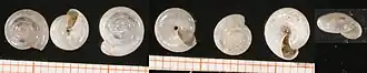 Das kleine, rechtsgewundene Gehäuse ist flach-kegelig. Es hat eine Breite (Durchmesser) von 4 bis 6 mm, und eine Höhe von 2,0 bis 2,9 mm In der Seitenansicht erscheint das Gewinde mäßig erhaben. Es sind 4½ bis 5 Windungen vorhanden, die mäßig rasch zunehmen. Die Endwindung ist an der Mündung etwa doppelt so breit wie die vorherige Windung. Die Oberfläche ist nur flach gewölbt, die Naht ist flach. Die Unterseite ist flach, der Nabelbereich ist nur wenig eingetieft. Der Nabel ist offen, aber eng. Die Mündung ist, abgesehen vom Anschnitt der vorigen Windung leicht abgeflacht elliptisch. In der direkten Aufsicht erscheint sie durch den starken Anschnitt der vorigen Windung etwas schief-halbmondförmig. Der Mündungsrand ist bis auf den Spindelrand gerade und zugespitzt. Im Bereich des Spindelrandes ist er kurz umgeschlagen und gelegentlich auch etwas verdickt.